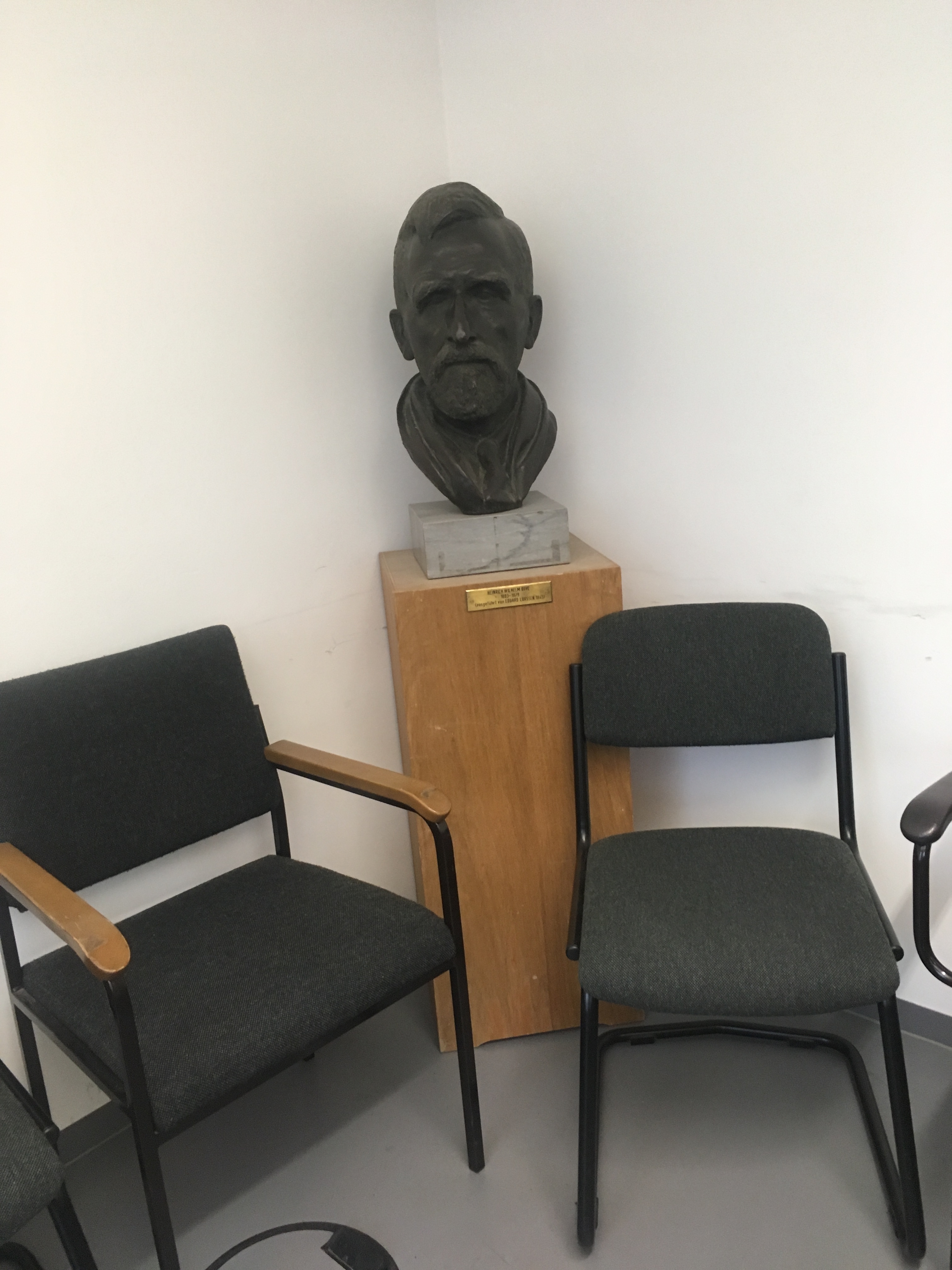Wer jedoch zwischen einem Vortrag und einer schleppend im Gang kommenden Diskussion einen Blick über die Schulter wirft, erblickt eine sonderbare Erscheinung: einen streng dreinschauenden, älteren Herrn mit schmalem Gesicht, buschigen Brauen über tiefliegenden Augen und lässigem Undercut. Die überlebensgroße Bronzebüste steht in der Ecke des Raumes auf einem niedrigen Holzsockel.