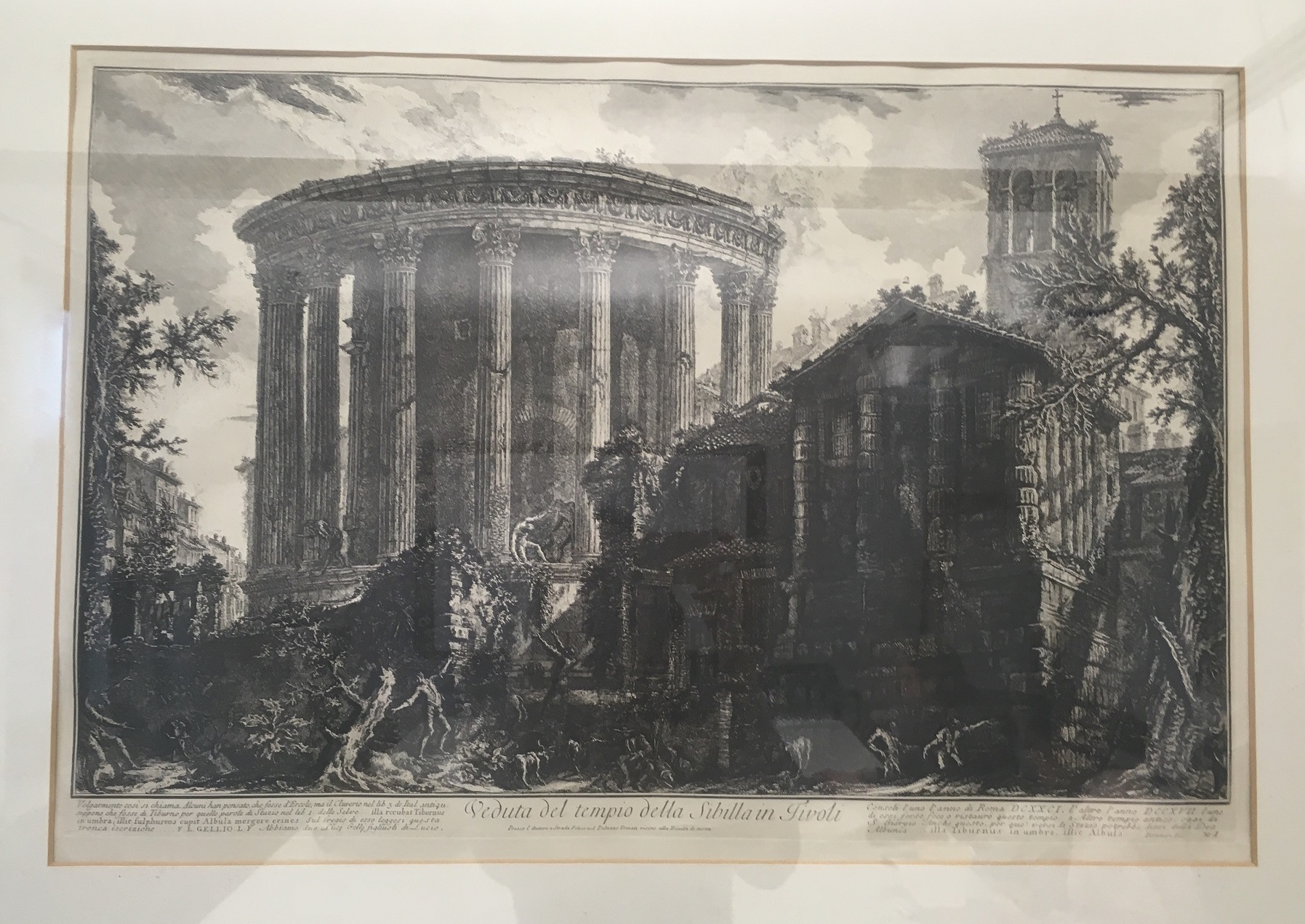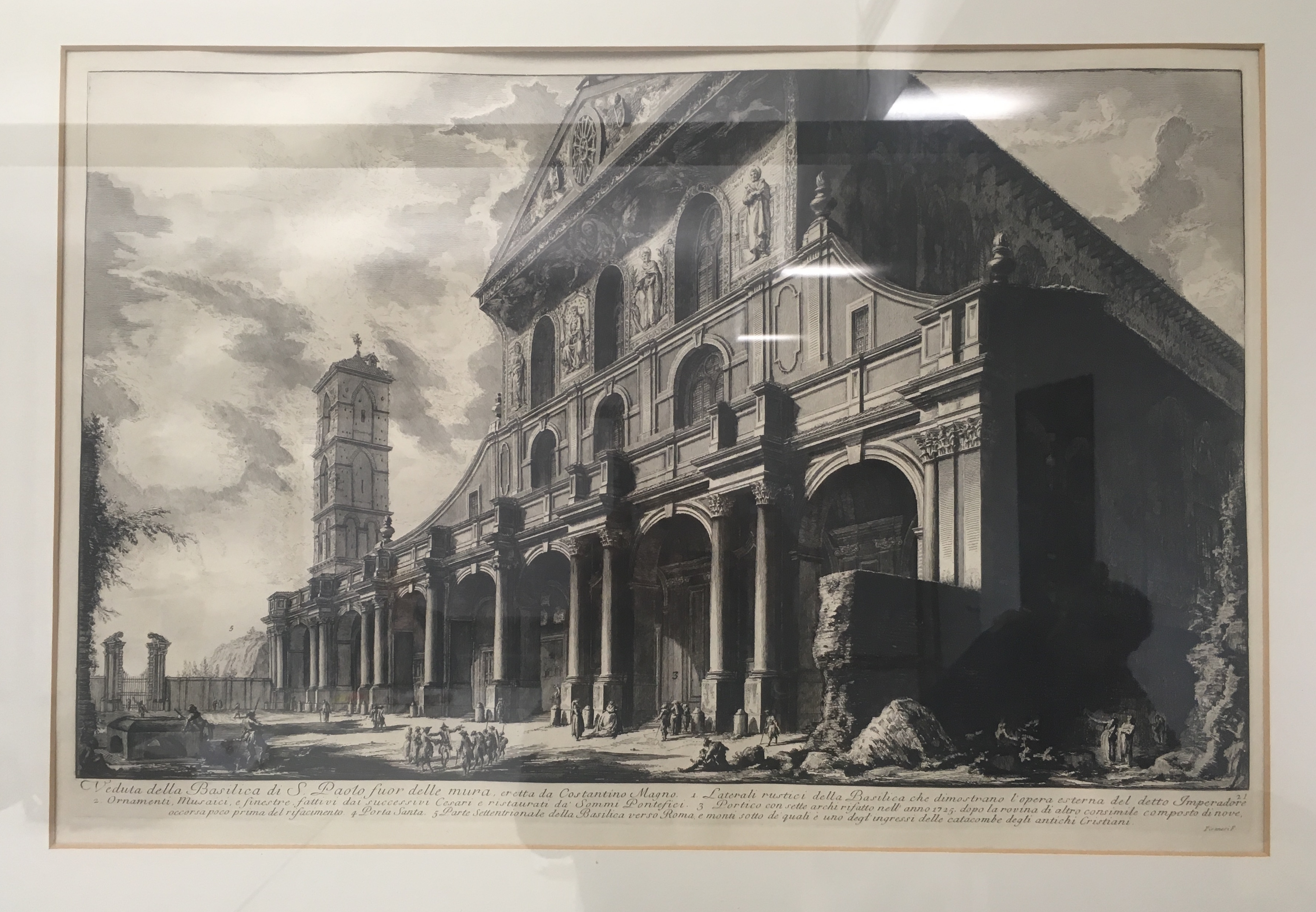 Doch nicht nur die Hamann-Büste borgte man sich aus der Kunstsammlung. Links von ihr hängen nebeneinander drei großformatige Graphiken. Zwar würde die dauerhafte Ausstellung von Arbeiten auf Papier unter direkter Sonnenlichteinwirkung so ziemlich jedem Restaurator Magenkrämpfe bereiten, doch uns Studierenden kommt sie gelegen. Immerhin stammen die Arbeiten aus einer der berühmtesten Serien von Romansichten des 18. Jahrhunderts: den ab 1748 erschienenen Vedute di Roma.