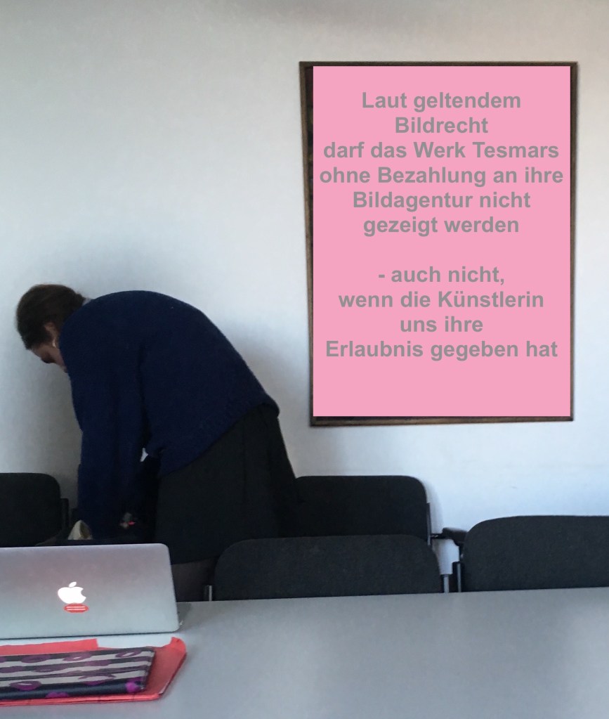 Nicht vom Licht, sondern von leibhaftigen Studierenden ist das letzte Werk in dieser kleinen Revue bedroht. Die großformatige Arbeit direkt neben der Tür hängt so tief zwischen Tisch und Stühlen, dass es einem Wunder gleichkommt, dass zu schwungvoll geschulterte Taschen noch keinen bleibenden Schaden angerichtet haben. Das verwegen platzierte Stück stammt von der Künstlerin und Dozentin Prof. Ruth Tesmar, die von 1993 bis 2015 am Institut das Seminar für künstlerisch-ästhetische Praxis leitete.
