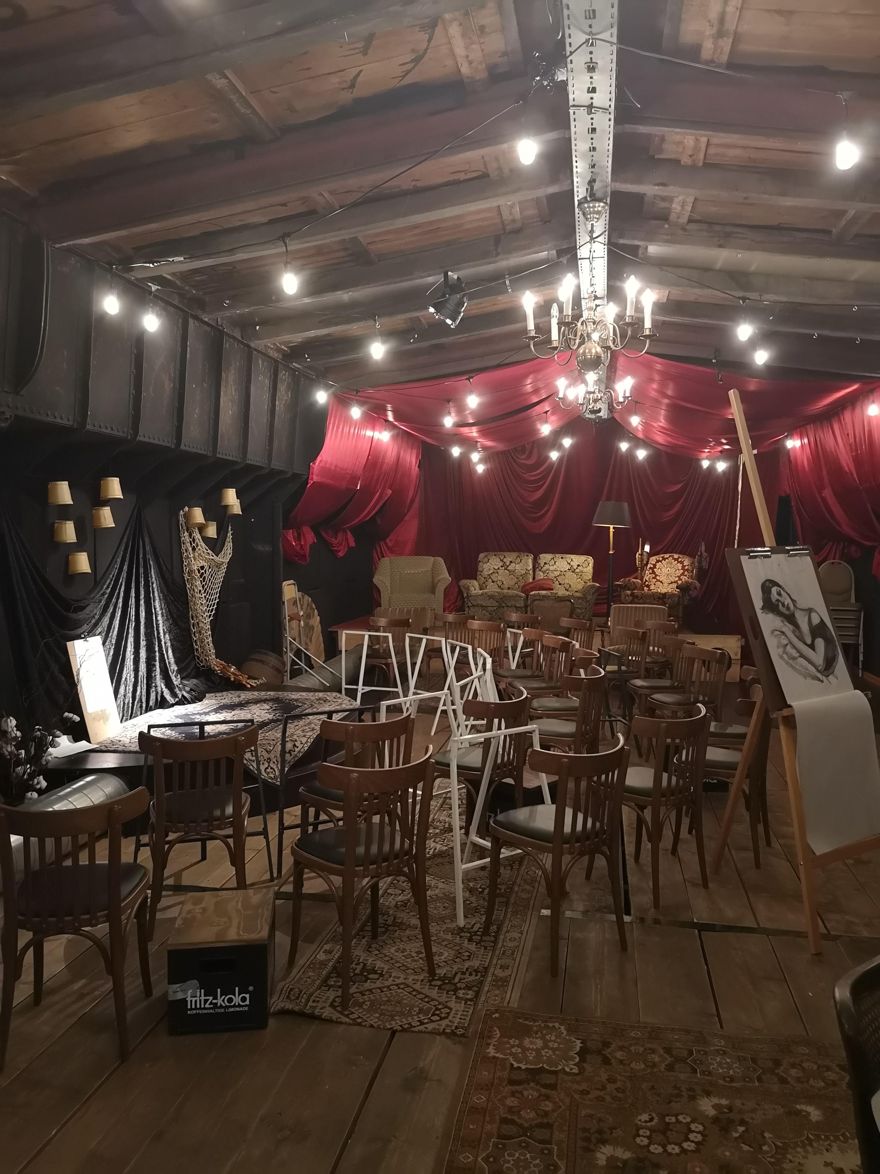 Der Kurs beginnt. Aufgrund der internationalen Künstler:innen wird er größtenTeils auf Englisch gehalten. Julian begrüßt die Anwesenden und lässt sie wissen, dass auf einem der Tische Material liegt, falls jemand etwas vergessen haben sollte. Es stehen zusätzlich Staffeleien zur Verfügung. Außerdem wird noch einmal auf die Bar verwiesen. Auch wenn es im Gegensatz zu draußen hier unten eine angenehme Temperatur herrscht, keine schlechte Idee, sich ein kühles Bier zu holen. Julian stellt das Modell und das heutige Programm vor: kurze Aktposen. Mit einem Handy stoppt Bajar die Zeit. Eine Minute vor Posenwechsel wird auf die diese hingewiesen. Entspannte Musik läuft im Hintergrund und das Modell nimmt die erste Pose für zwei Minuten ein. Große Lichterketten und drei Kronleuchter hängen über dem Modell und den auf Holzstühlen sitzenden Zeichnenden. Zusätzlich zu den Stühlen befindet sich links der Bühne ein kleines Podest mit einer weiteren Couch und einem Sessel, auf dem ebenfalls konzentrierte Besucher:innen sitzen. Über ihnen spannt sich ein roter Stoff, wie ein Baldachin, bis hinunter an den Wänden. Ein toller Kontrast zu der schwarzen Wandfarbe. Das gesamte Schiff scheint, mit seiner Einrichtung, selbst ein Kunstwerk zu sein.