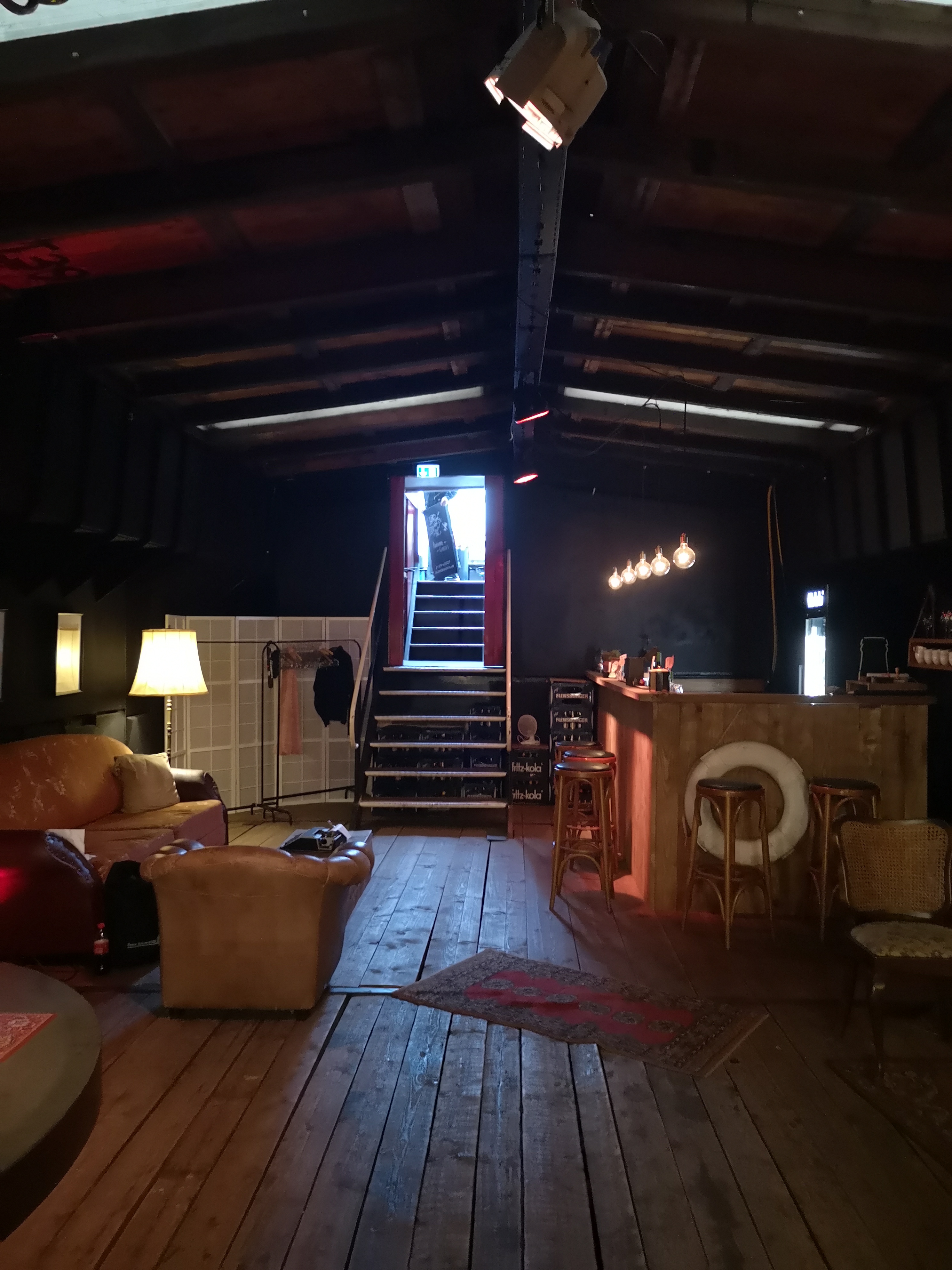 Gleich am Eingang befindet sich eine Bar im schummrigen Licht. Die Wände sind schwarz gestrichen, Zeichnungen in Rahmen hängen in regelmäßigen Abständen an den Wänden und laden zum Betrachten ein. Entlang der Seiten befinden sich urige Sessel und Sofas. Einige Teppiche mit orientalischen Mustern auf dem Boden. Insgesamt ist die Atmosphäre gemütlich.